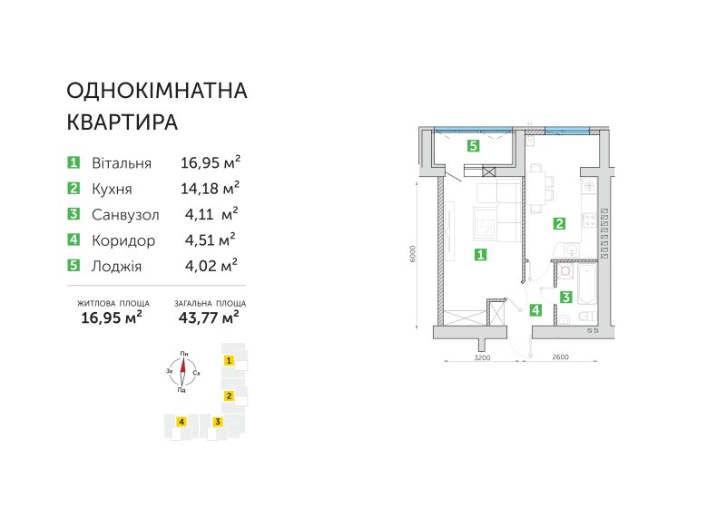 4. Однокімнатні квартири у ЖК «Парковий квартал» в Ковелі за акційною ціною. Загальна площа – 43,77 м2. Площа кімнати – 16,95 м2, що дозволяє поділити її на окремі зони: так званий громадський простір та місце для сну. Також в квартирі – велика кухня (14,18 м2), суміщений санвузол (4,11 м2), коридор (4,51 м2) та лоджія (4,02 м2).