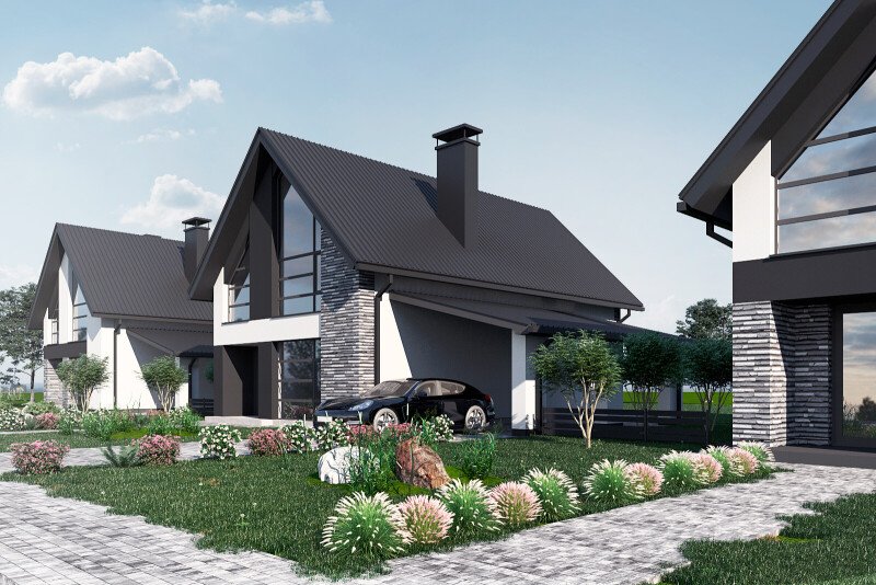 3. Котеджі у ЖК «Струмочок». Площа – 156,06 м2, можливі два варіанти планування – з суміжними і роздільними кухнею та вітальнею на першому поверсі. Відтепер котеджі пропонують із спеціальним навісом для автомобіля.