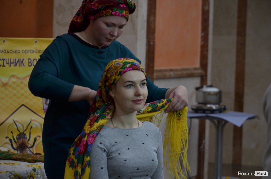 «Для того, аби зробити свічку, віск потрібно розтопити на паровій бані. Нагрівається він до семидесяти градусів і плавиться. Наша громадська організація «Пасічник Волині» долучилася до свята. Тож я виготовляю з гостями свічки, а Галина поруч показує, як в’язати хустки нареченим», – каже Юрій Міщериков.