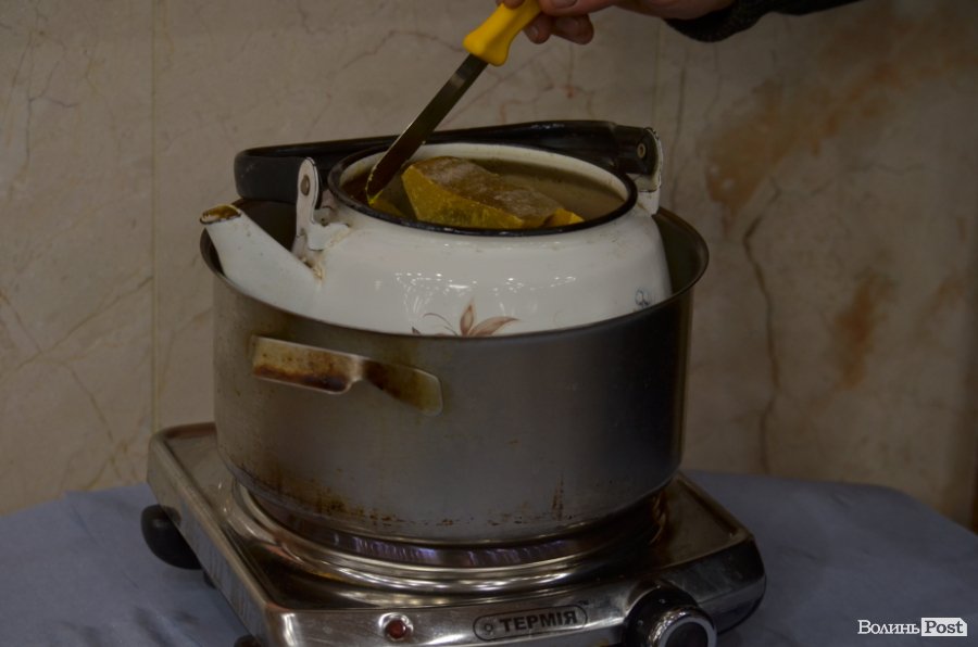 Поруч із пані Катериною розташувався бджоляр Юрій Міщериков, який щось ретельно перемішує у чайничку на електроплиті. Це - великі шматки воску. Сьогодні він показує, як варити свічки.