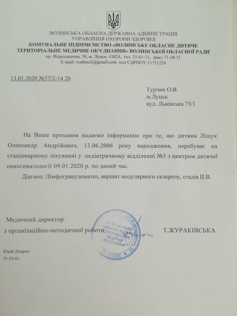 13-річний Олександр Ліщук потребує дороговартісного лікування. Нещодавно лікарі встановили хлопцю діагноз – “Лімфогранулематоз, варіант нодулярного склерозу, стадія ІІ В”.