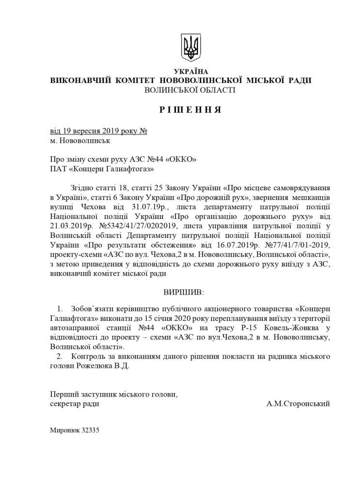 Рішенням виконкому від 19-го вересня 2019 року було зобов’язано керівництво ПАТ “Концерн Галнафтогаз” виконати до 15 січня 2020 року перепланування виїзду з території АЗС «ОККО» на трасу Р-15 Ковель-Жовква. На сьогоднішній день робота по зміні схеми руху не розпочата.