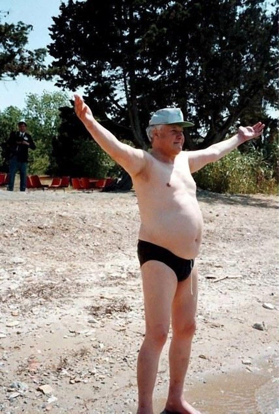 3. Борис Єльцин завжди був близький до народу. Навіть його пляжний костюм нічим не примітний: прості чорні плавки і кепка з козирком, як у більшості чоловіків пострадянського простору. Те, що це не простий громадянин гріється на сонечку, видає тільки серйозний дядько в костюмі на задньому плані цього фото.