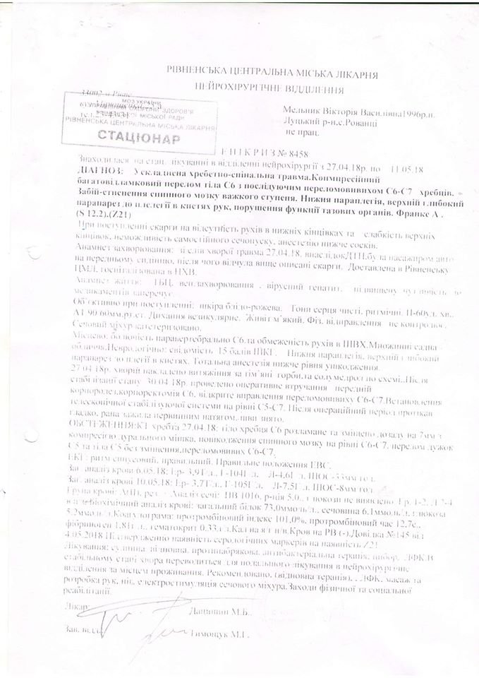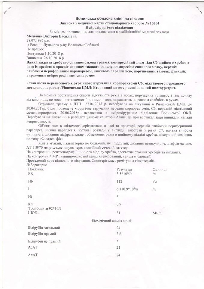 Жінка повідомляє, 27 квітня 2018 року Мельник Вікторія Василівна, жителька села Ярославичі Млинівського району Рівненської області потрапила в ДТП. Після цього нещасного випадку молода жінка не може самостійно ходити. Лікарі зробили дві операції на хребті. Вікторія пройшла декілька курсів реабілітації, але це тільки початок боротьби за одужання. Потрібні кошти для подальшого лікування і реабілітаційних заходів.
