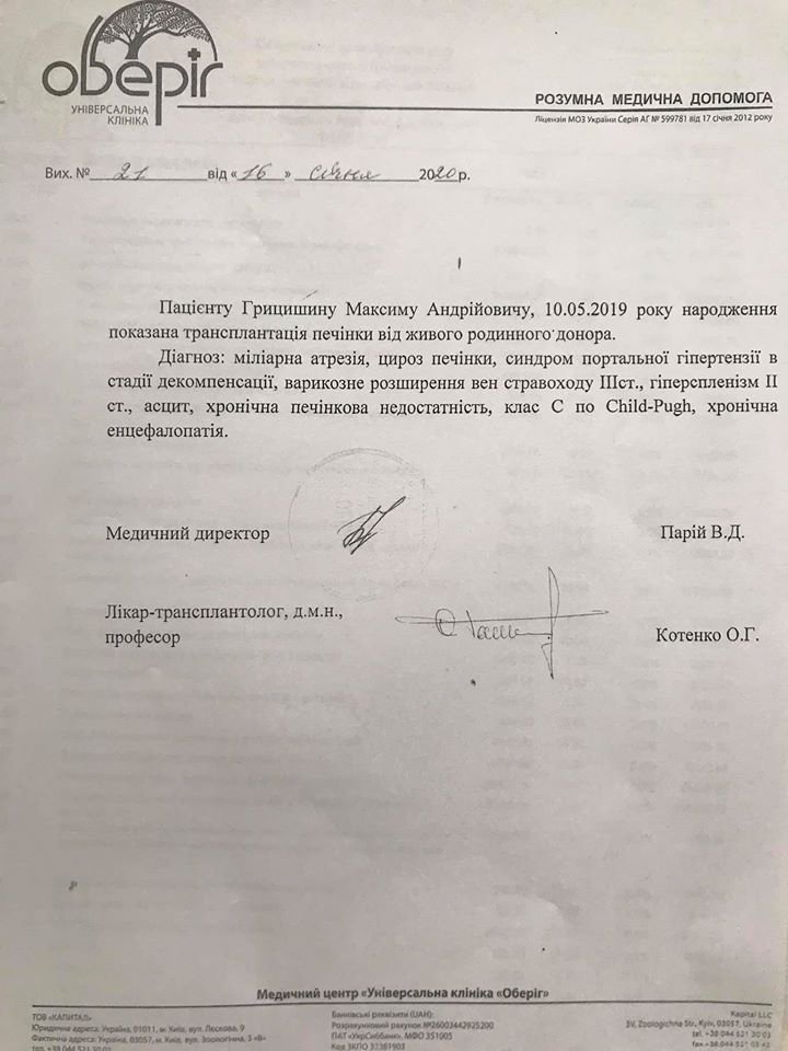 Хлопчик потребує складної операції з пересадки печінки. Наразі після обстежень виявили, що батько хлопчика, Андрій, може стати донором для сина. За пересадку готові взятися в клініці «Оберіг», проте сума непідйомна для батьків.