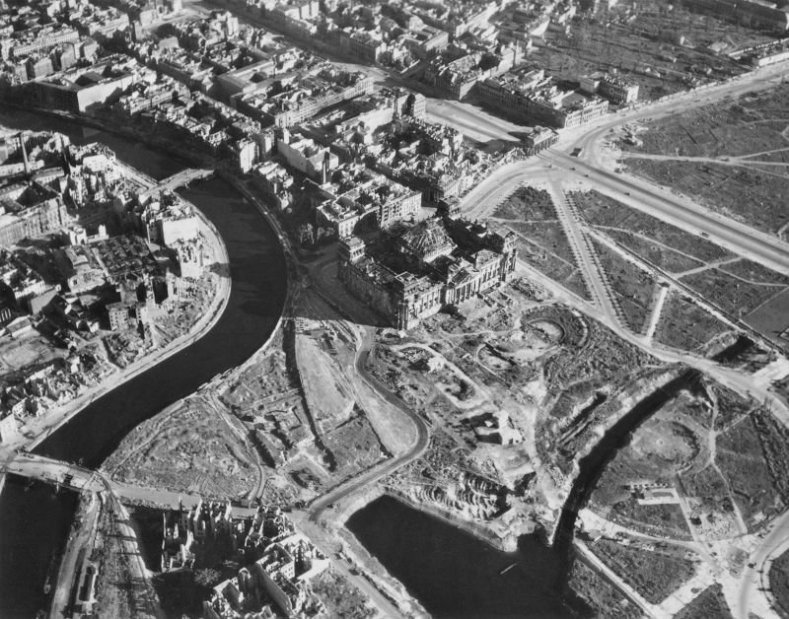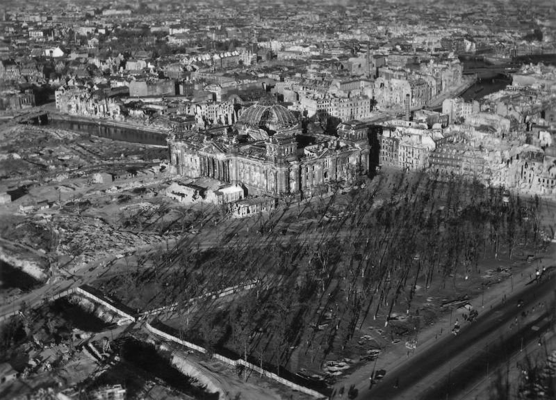 Вид на річку Шпрее і Рейхстаг, побитий бомбами і снарядами.