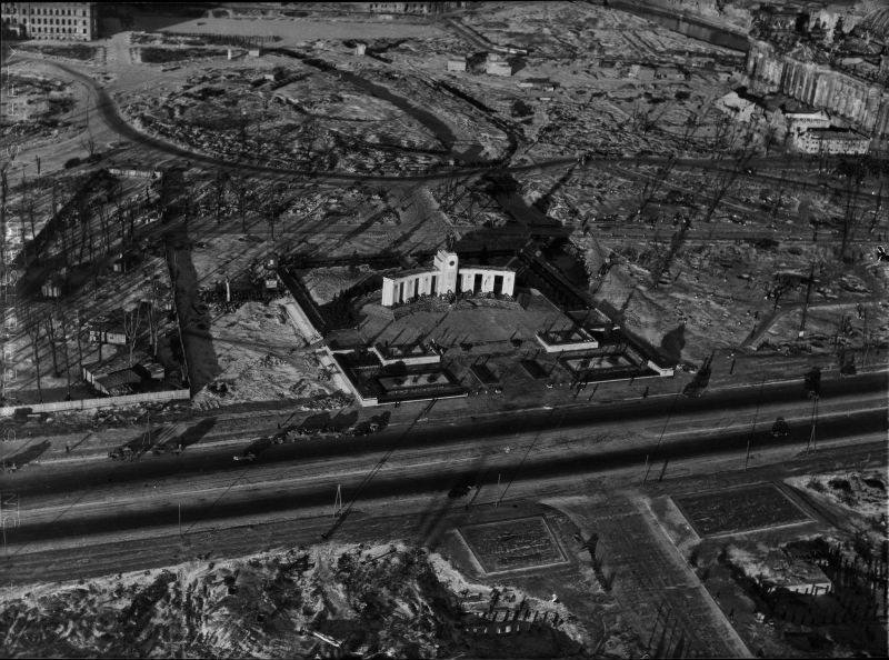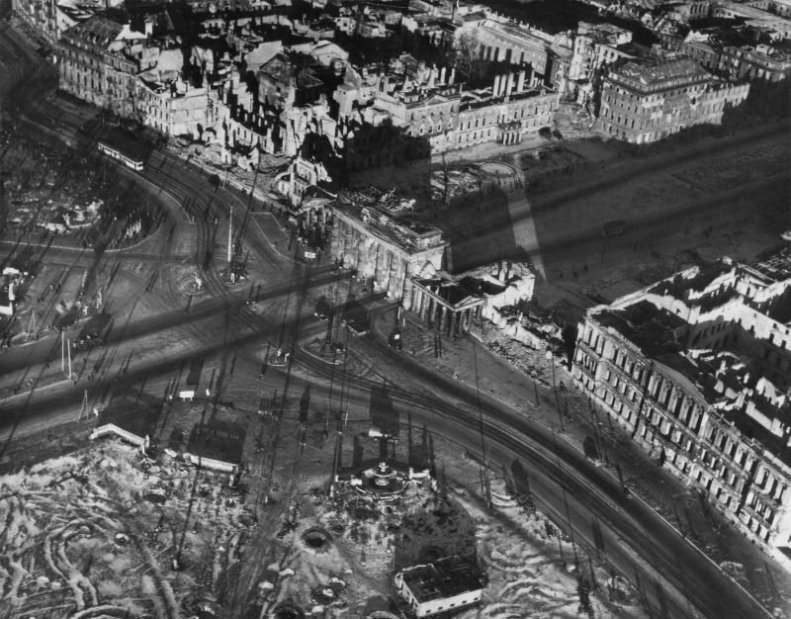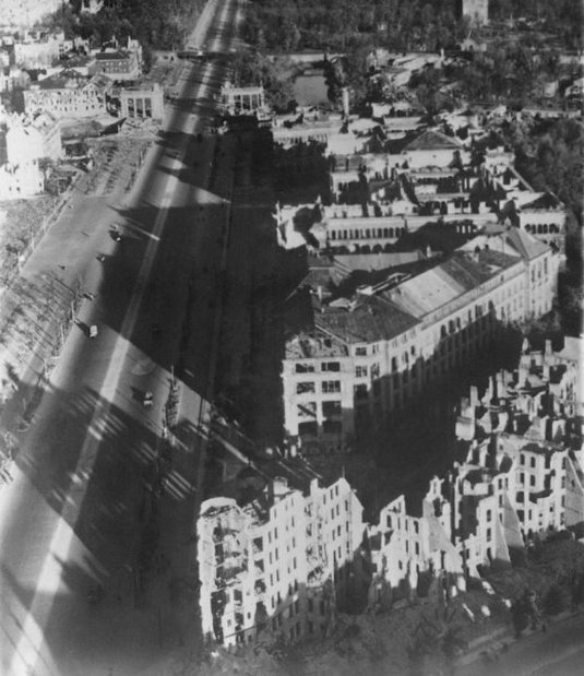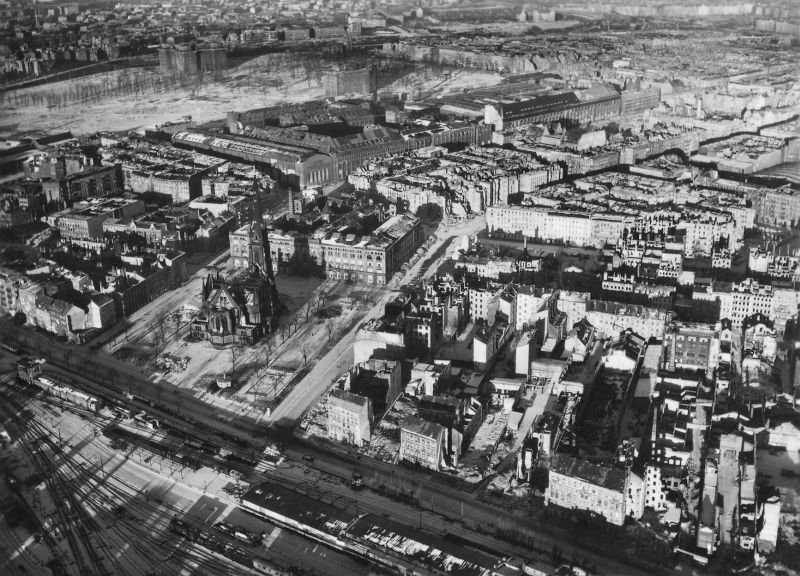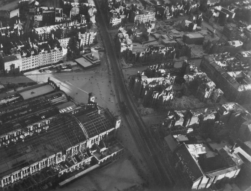 В останні дні війни багато будівель навколо площі Александерплац були знищені. Зліва на фото універмаг «Wertheim», залізнична станція, будинок Бероліна, торговий центр «Tietz» і пансіон «Alexanderhaus».