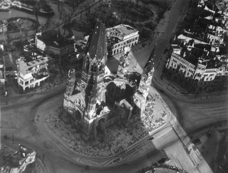 Меморіальна церква кайзера Вільгельма, яка дуже постраждала під час нальоту 23 листопада 1943 року. З тих пір церква так і залишилася в руїнах ‒ як слід руйнівної сили війни.