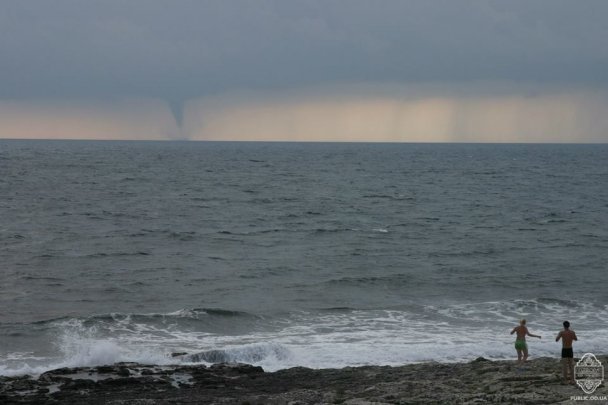 Сфотографувала місце народження смерчу Мирослава Степанюк 4 червня. На знімках видно, як велетенські стовпи водяного пилу виринають з Чорного моря. Все відбувається за декілька кілометрів від берега.