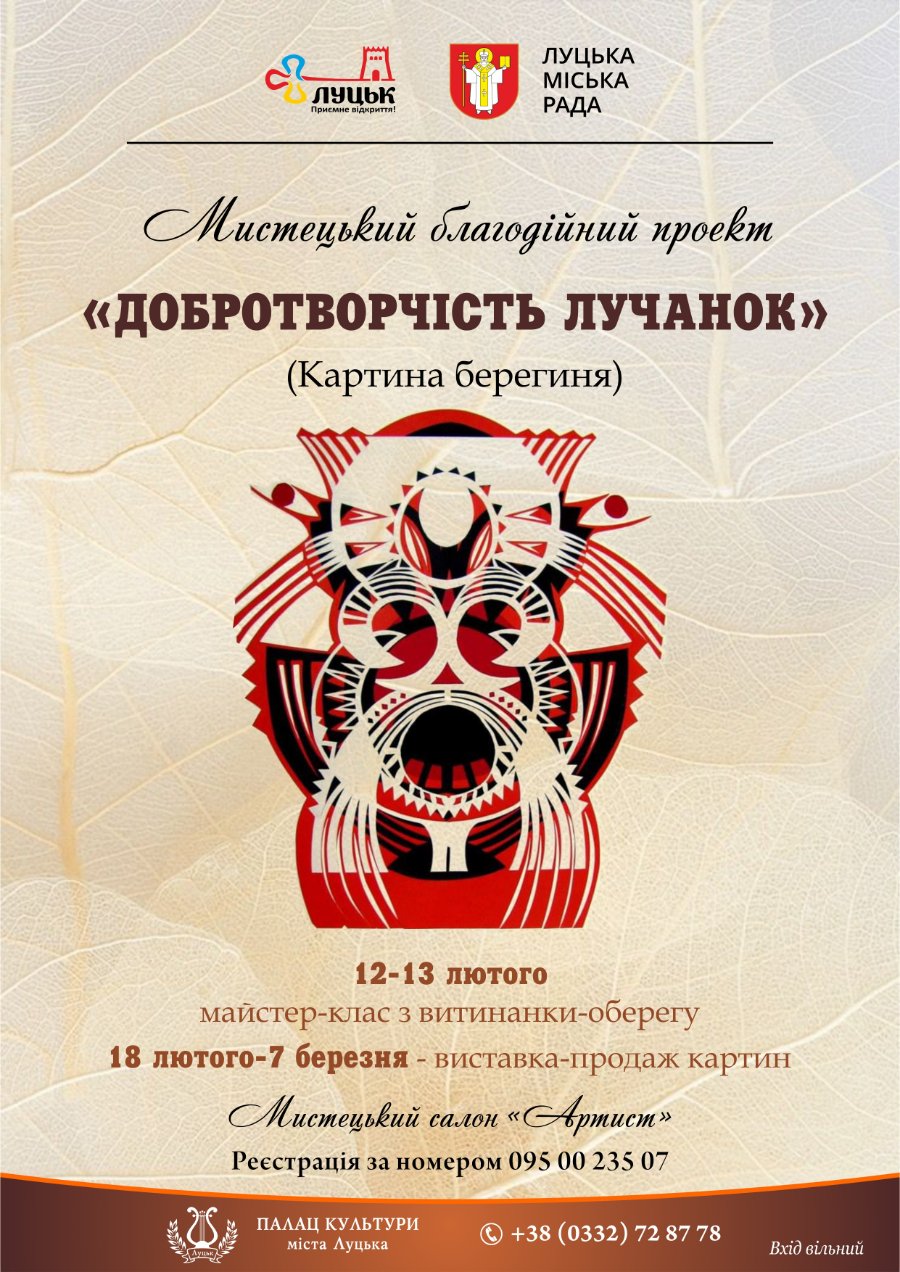 З 18 лютого по 7 березня відбудеться виставка творчих робіт "Добротворчість лучанок". Витинанки будуть експонуватися впродовж двох тижнів у мистецькому салоні «Артист». На офіційній сторінці Палацу культури міста Луцька у мережі facebook відбуватиметься відкритий аукціон робіт.