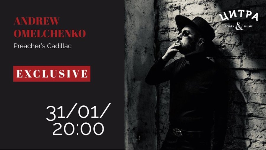 Що обіцяють: Andrew Omelchenko повертається у Цитру. 31 січня гості почують старі, добрі хіти та авторські пісні від лідера гурту Preacher’s Cadillac. Вхід вільний. Бронювання місць: 050 880 2555.