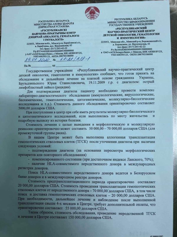 29 січня цього року лікарі з Білорусі поставили йому страшний діагноз – гострий лімфобластний лейкоз (рецидив).
