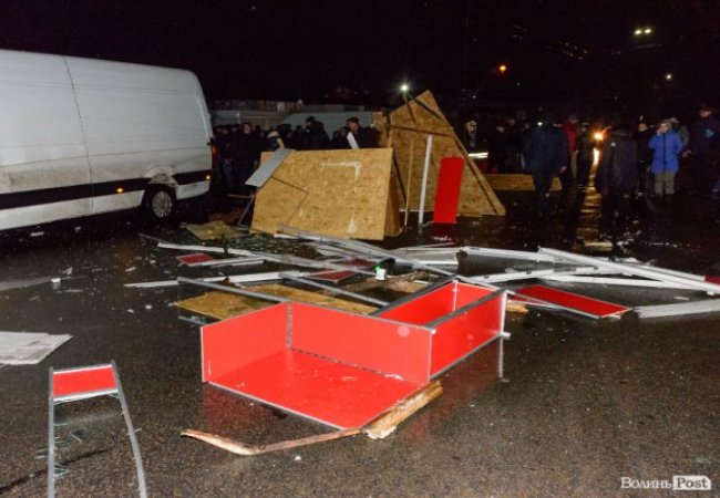 Попередньо встановили, що на виконання рішення Луцької міської ради співробітники муніципальної варти за допомогою спецтехніки розпочали демонтаж торговельних споруд. Під час цього було пошкоджено декілька торговельних кіосків. Протестувальники перекрили рух спецтехніки. Демонтаж торговельних кіосків зупинили.