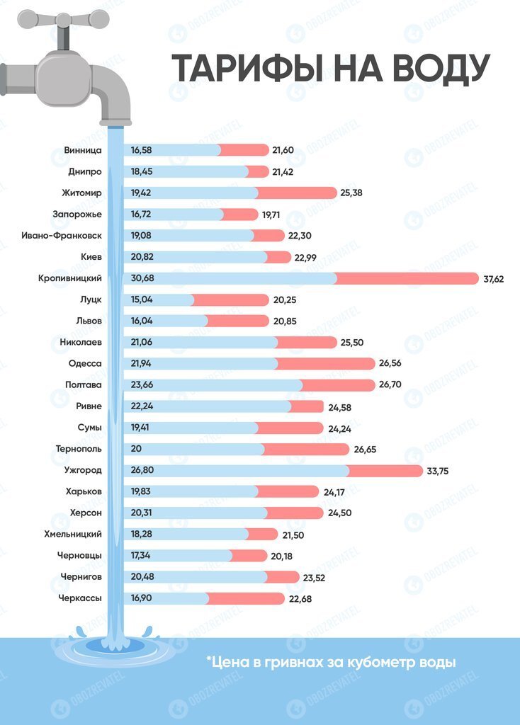 Найбільше доведеться заплатити жителям Кропивницького й Ужгорода, кубометр води тут буде коштувати по 37,62 грн і 33,75 грн відповідно. Найменший тариф буде в Запоріжжі, Чернівцях, Луцьку та Львові – від 19,71 грн за куб. м.