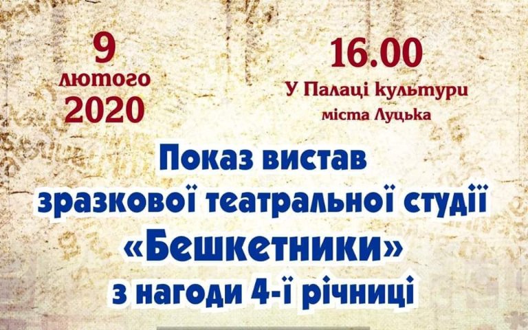 Що обіцяють: 9 лютого о 16.00 відбудеться відкритий показ вистав зразкової аматорської театральної студії «Бешкетники» Палацу культури міста Луцька з нагоди 4 річниці