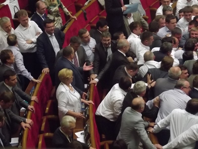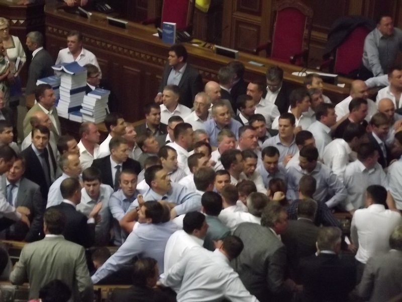 Врешті-решт Рибак розпочав засідання, але з місця для гостей, бо президія була заблокована. Опозиціонери створили кілька «точок», де зав’язалися бійки. Одна з них – в центрі залу, на чолі з Яценюком, неподалік від місця нардепа з Волині Катерини Ващук.