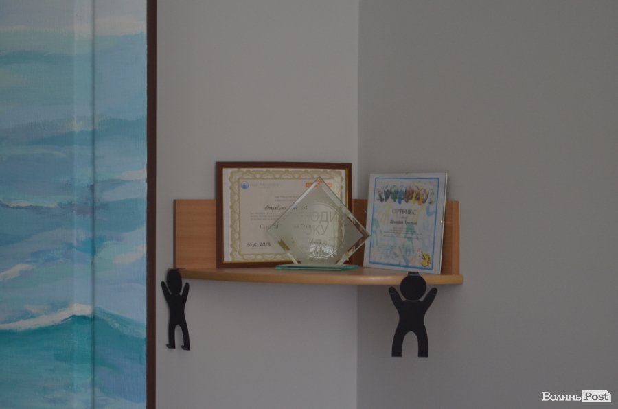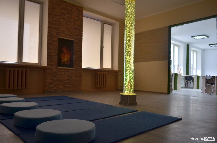 У центрі кімнати встановили трубу з підсвіткою на весь зріст, всередині – вода та повітря, а кольори можна змінювати за допомогою автоматичного перемикача. Поруч розклали каремати з подушками, на стіну позаду нанесли образи моря і пінисті хвилі, збоку на цегляній основі повісили картину каміна, а стіну попереду обмастили річковим піском, таким чином, поєднуючи жіноче та чоловіче начала разом із усіма стихіями та людиною у центрі. Усю цю картину доповнює фонове звучання криків чайок та шуму прибою. За стіною з морськими мотивами знаходиться кабінет штатного психолога, який працюватиме, безпосередньо, окремо із кожним членом групи, що проходить реабілітацію.