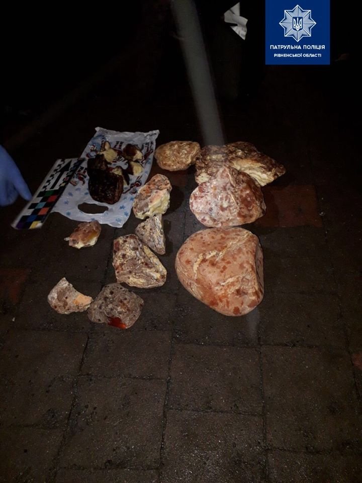 На місце події викликали слідчо-оперативну групу, які це каміння вилучили. Також вилучили каміння, яке знаходилось в автомобілі. Загальна вага вилученого каміння складає близько 3 кг, але автомобіль не вилучався. На 31-річного водія склали протокол за ст. 130 КУпАП (керування в стані сп'яніння) по відмові.
