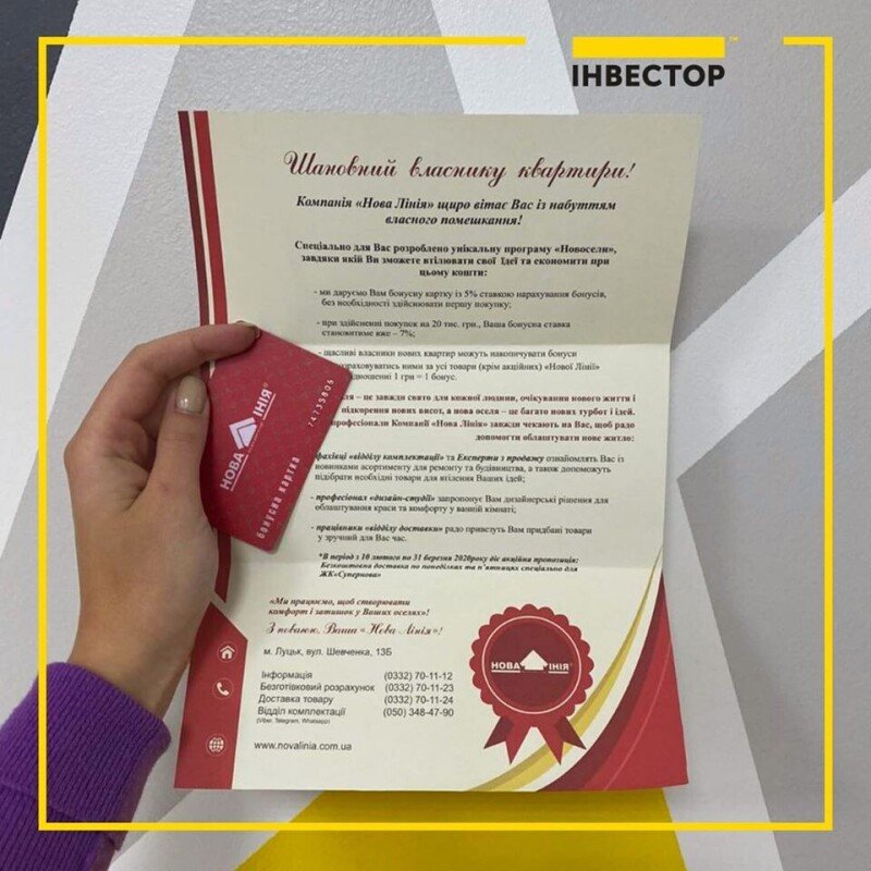 Будівельна компанія «Інвестор» разом з магазином «Нова лінія» запустили спільну програму лояльності: власникам квартир житлового комлпесу «Супернова» даруватимуть знижки на товари гіпермаркету, безплатну доставку та сертифікати.