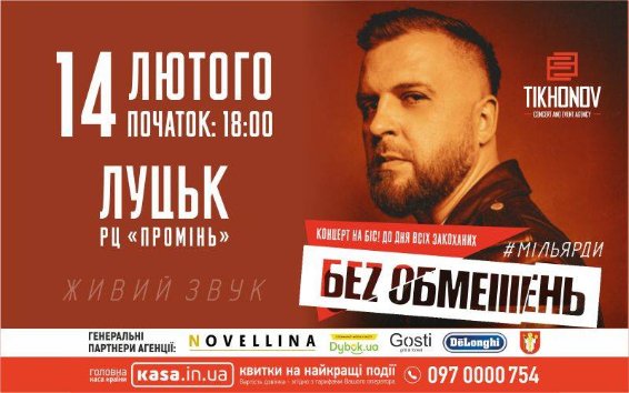 Що обіцяють: Радять не пропустити нагоду відсвяткувати найромантичніший день року у компанії мегапопулярного українського рок-гурту «Без обмежень». Музиканти завітають до міста Луцька 14 лютого 2020 року із феєричним концертом на біс під назвою «#Мільярди».
