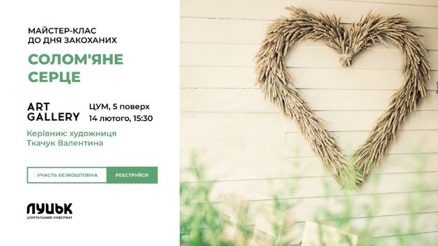 Що обіцяють: В Art Gallery (5 поверх ЦУМу) відбудеться майстер-клас «Соломʼяне серце» до Дня закоханих із декоративно-прикладного мистецтва. Реєстрація за посиланням: http://bit.ly/ArtGallery_1402. Керівник: художниця Ткачук Валентина. «Мистецтво для двох – чудова нагода висловити свої почуття подарунком, зробленим своїми руками», – пишуть організатори.