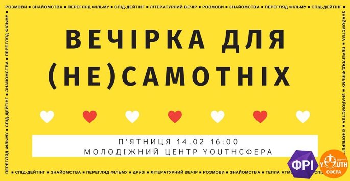 Що обіцяють: Запрошують на нашу вечірку «Для (не) самотніх». Гарантують гарний вечір. На гостей чекатимуть численні розмови та знайомства з крутими людьми, перегляд повнометражного фільму в неймовірній атмосфері, спід-дейтінг та на завершення - літературний вечір. Команда Lutsk Nétwork буде рада бачити усіх.