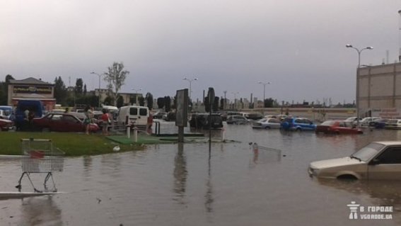 На Євпаторійському шосе від води постраждав один з торгових центрів. В приміщенні люди ходили по щиколотку у воді, а на парковці по вікна залило автомобілі.