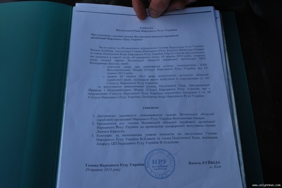 «Сьогодні, 9 червня на 11:00 було скликано актив партії Волинської області для вирішення ряду проблем, серед яких - і питання самовільного захоплення приміщення колишнім головою партії Володимиром Банадою», - розповідає виконувач обов’язків голови Волинської крайової організації «Народний Рух України» Дмитро Климук.
