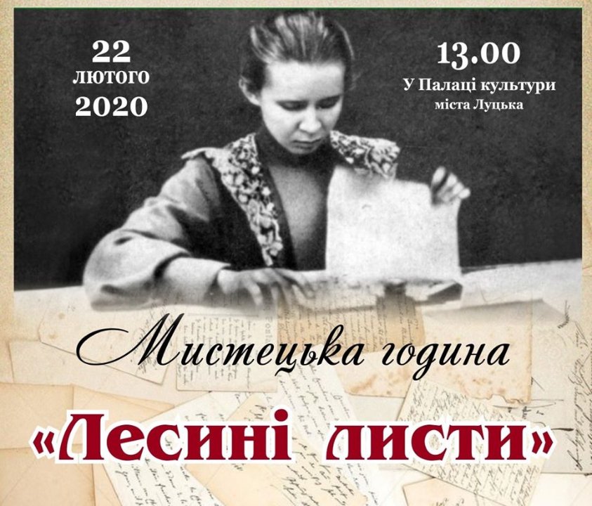 Що обіцяють: 22 лютого о 13.00 у Палаці культури міста Луцька відбудеться мистецька година «Лесині листи» за участі зразкової аматорської театральної студії "Бешкетники" та «Паперової майстерні Олесі Іщук». Передуватиме творчому заходу майстер-клас з виготовлення листів з доповненою реальністю, де кожен учасник зможе сам виготовити лист в якому втілити та розкрити ідею обраного твору.