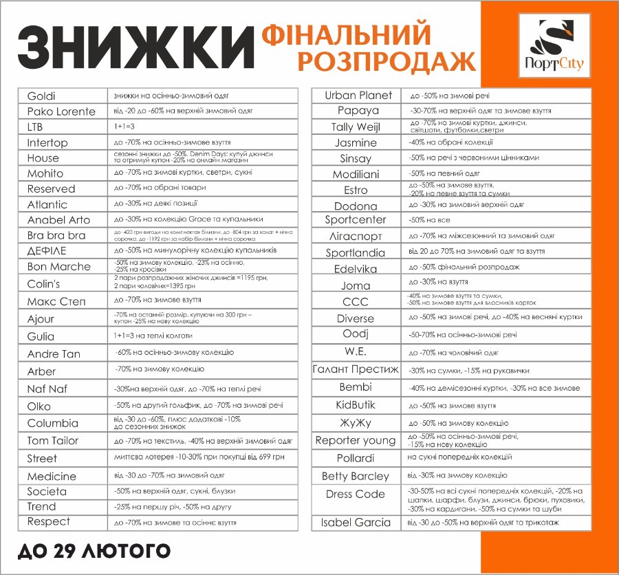 «Це хороша нагода придбати теплі речі з величезною знижкою. Шукайте улюблений магазин у таблиці знижок та зробіть свій шопінг приємним та вигідним. Купуйте вигідно – купуйте у «ПортCity!», - йдеться у повідомленні.