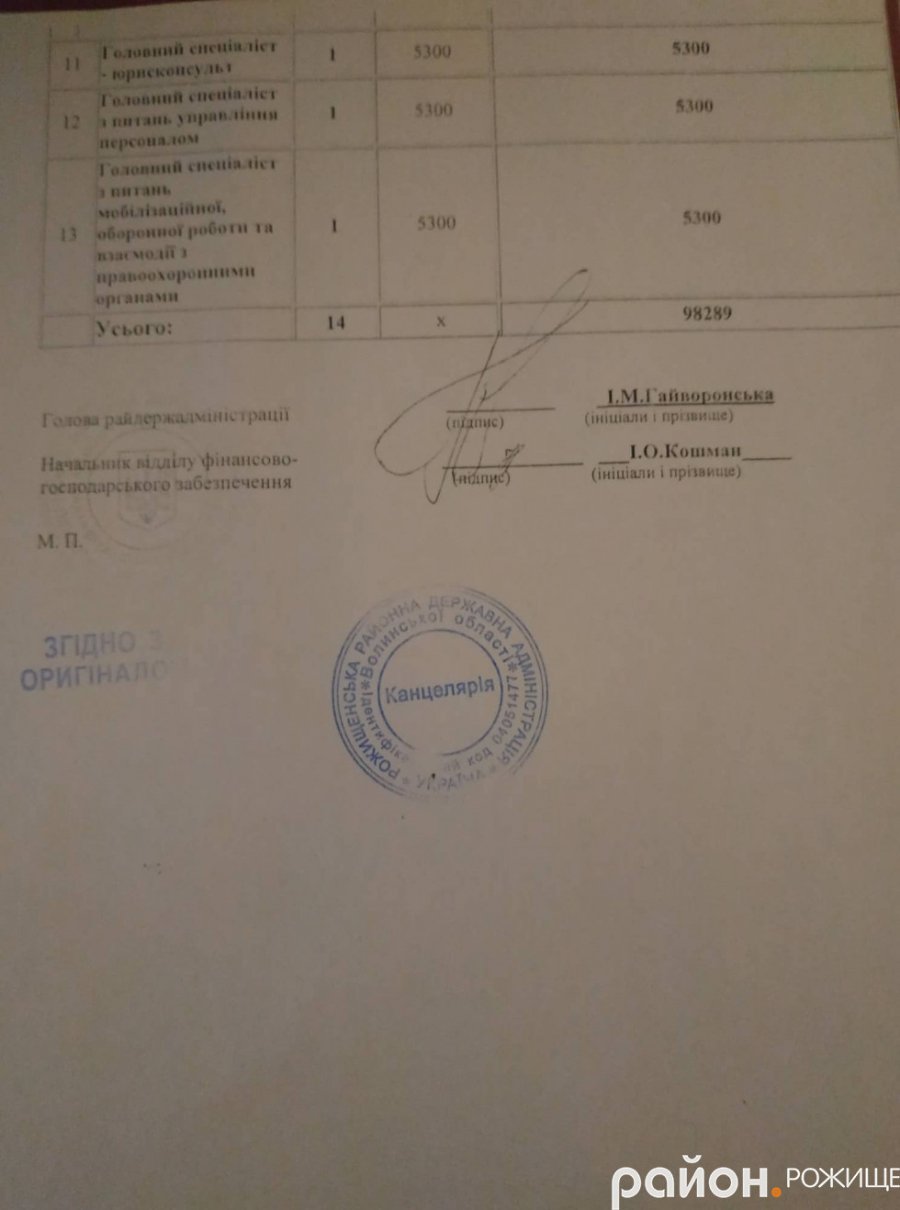 У апараті Рожищенської районної державної адміністрації нині працює 14 осіб. За штатним розписом, на цих посадах отримують посадові оклади на загальну суму 98 289 гривень на місяць.