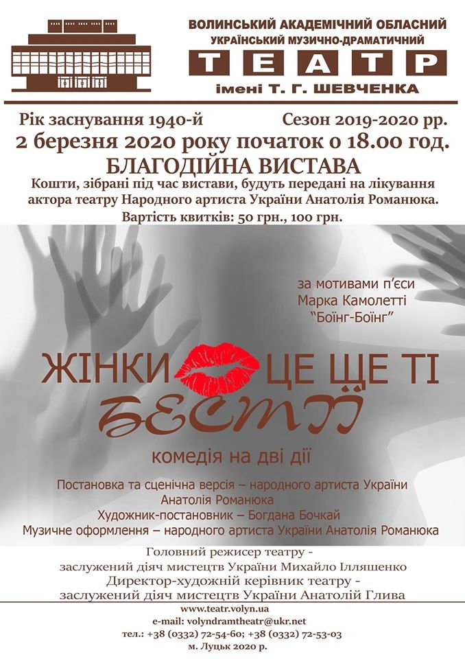 У Луцьку організовують благодійну виставу "Жінки - це ще ті бестії", кошти з якої будуть передані провідному актору драмтеатру та народному артисту України Анатолію Романюку. Чоловік потребує термінової операції, яка коштує приблизно 100 тисяч гривень.