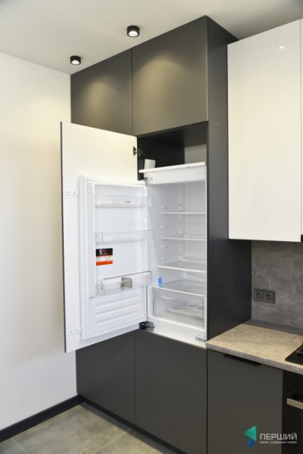 Ідемо на кухню. Вона в білих і графітових тонах. Керамограніт під бетон. Точкові світильники на стелі. Вмонтована посудомийна машина. Котел та холодильник – сховані.