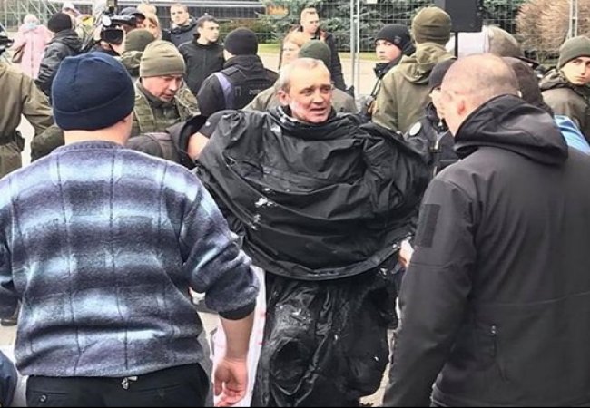 Кореспондентка ТСН з місця подій повідомляє, що чоловік під час мітингу проти Фонду держмайна вибіг із натовпу і вже горів.