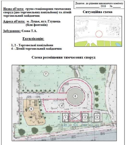 Праворуч від фонтану, неподалік головного входу до Центрального парку на вулиці Глушець у Луцьку планують розмістити кілька об’єктів для торгівлі.