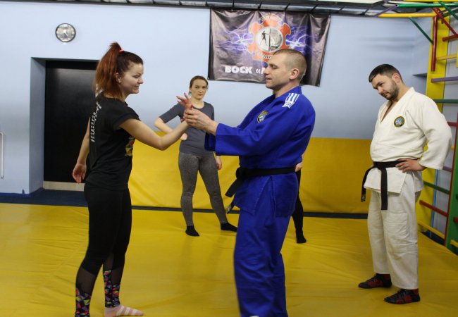 На першому занятті учасниці разом з тренерами Дмитром та Олексієм розминались, виконували вправи, слухали теорію та ставили багато запитань. Також вони спробували виконати набір вправ, наприклад, як правильно падати і що робити, аби збити з ніг нападника.