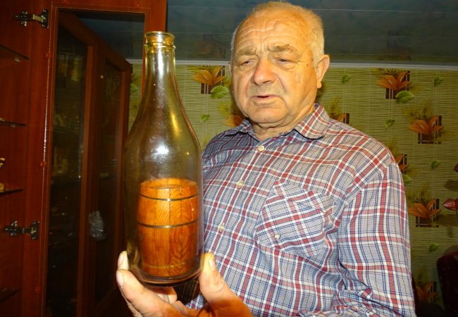 "Інші роботи не раз повторював, а ця — в єдиному екземплярі. З нею стільки мороки! Не захотів другу таку бочку у пляшці монтувати", — каже Валентин Поліщук.