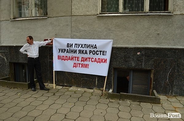 На його думку, проблема полягає в тому, що садочки використовують не за призначенням – у них розташовані інші установи та організації. Гасло на банері: «Ви пухлина України яка росте! Віддайте дитсадки дітям!» адресоване працівникам Центру надання адміністративних послуг Луцької міської ради.