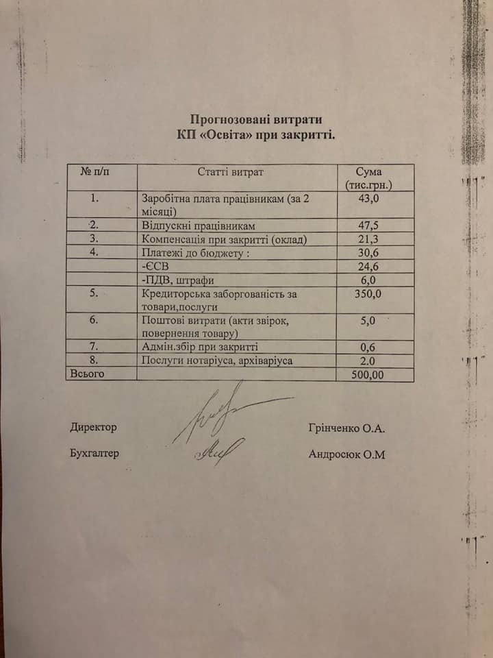 6) підприємству було запропоновано перейти на власні площі обласної ради по вул. Винниченка, зроблено ремонт на кошти бюджету, однак керівництво підприємства вирішило не переходити і подало кошторис на ліквідацію.