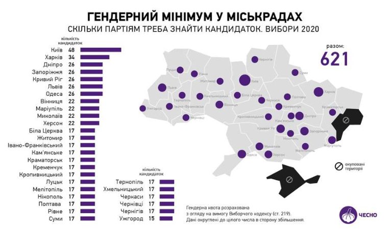 Рух ЧЕСНО підрахував, скількох кандидаток потрібно знайти партіям для участі в місцевих виборах 2020 року, якщо вони планують висунути повну лінійку кандидатів для Луцької міської ради – 42.