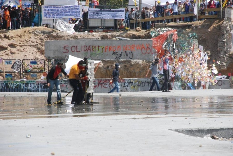 О 14:30 поліція почала штурмувати парк, використовуюючи перцевий газ та невідому речовину, що розпилюється у вигляді жовтого і помаранчевого диму. Також застосовуються водомети та гумові кулі. На 15:00 сутички в парку ще тривали, чимало людей отримали поранення.