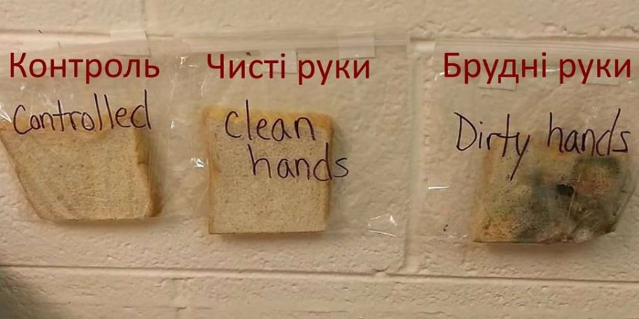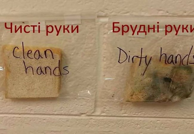 Потім ретельно миєте руки з милом (для більшого ефекту можна засікти 15 або 30 секунд). Витираєте руки свіжим текстильним або паперовим рушником і мнете в руках третій шматок хліба. Ставите його в третій пакет - «Чисті руки».
