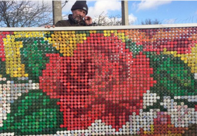 Зараз Микола Борисович перебуває на заслуженому відпочинку, але його душа – в постійному творчому пошуку… До свята для коханої з кольорових кришечок від пластикових пляшок він виготовив ось такий сигмент для домашньої огорожі. Чи буде вся огорожа такою покаже час, але очі коханої вже мають чому радіти.