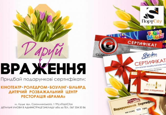 У торгово-розважальному центрі «ПортCity» можна придбати подарункові сертифікати на усі зони відпочинку: кінотеатр «PremierCity», роледром «GeneratorCity», боулінг, більярд «StrikeCity», дитячий розважальний центр «FigliMigli», а також на ресторацію «Брама».