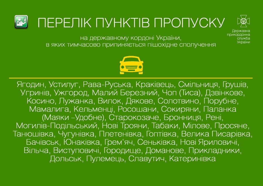 З усієї кількості пунктів пропуску та пунктів контролю відповідно до Розпорядження КМУ від 13.03.2020 №288-р тимчасово закрили 94. Крім того, у 49 пунктах пропуску, що залишаються функціонувати, тимчасово припиняється пішохідне сполучення.