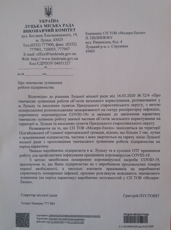 Секретар міської ради Григорій Пустовіт звернувся до керівника СП ТОВ “Модерн-Експо” Петра Пилипюка з проханням розглянути можливість тимчасового зупинення виробничих потужностей на період карантину.