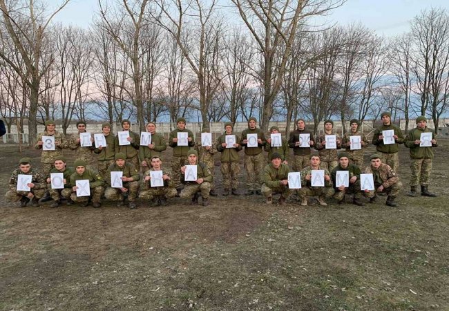 На світлині – солдати тримають картки із літерами, із яких складено напис «З Днем народження, кохана мама».