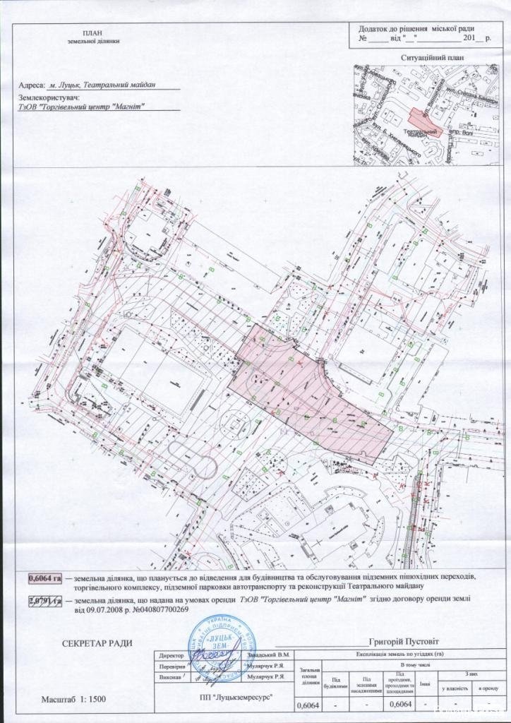 У секретаріаті Луцької міськради зареєстрували проект рішення про поновлення договору оренди землі ТОВ «ТЦ «Магніт» для будівництва та обслуговування підземних пішохідних переходів, торгівельного комплексу, підземної парковки автотранспорту та реконструкції Театрального майдану.