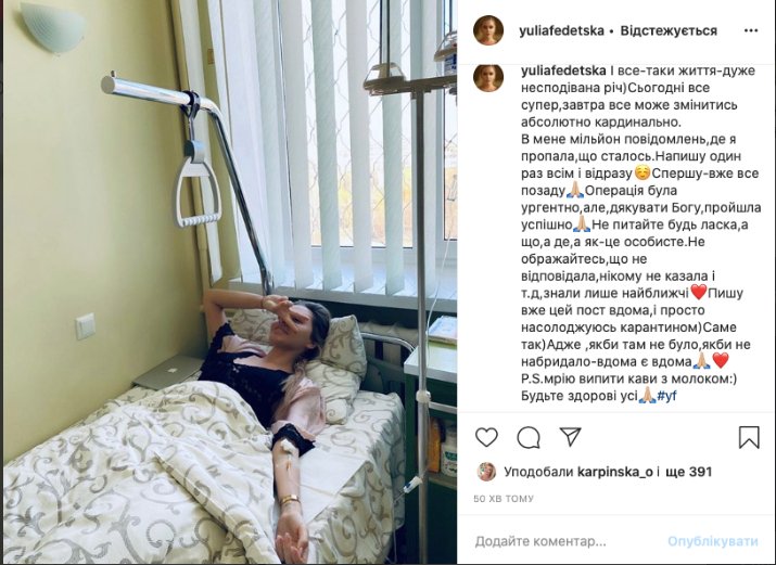 Юлія зазначила, що перенесла операцію і вже перебуває вдома, мріє випити кави із молоком.