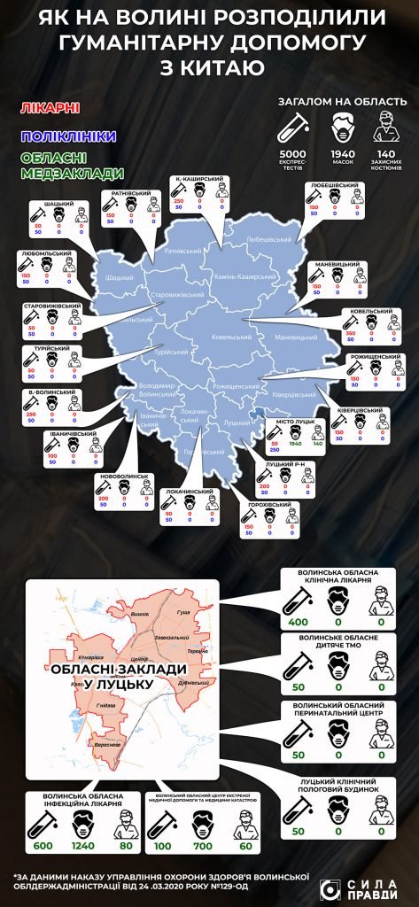 Управління охорони здоров’я Волинської обласної державної адміністрації на запит Центру журналістських розслідувань «Сила правди» оприлюднило наказ, яким між медичними закладами краю розподілили першу гуманітарну допомогу з Китаю, що надійшла в Україну 23 березня.